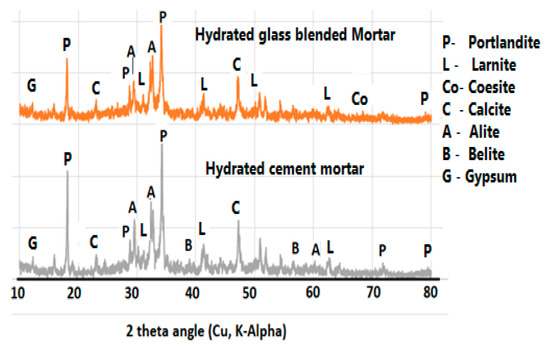 The XRD presented in Figure 15 shows the presence of gypsum in both hydrated cement and glass blended binder. In the EDS, the presence of Ca, Si and S is very conspicuous in Aft regions, even though XRD could not detect Aft in the sample or the sulfate-based compound [41]. Feng et al. [43] also reported that Aft could easily form within the pore where portlandite is formed, thereby allowing it to grow without a stress-dependent damage. This explains why the inner microstructural cracks (Figure 13) are found in C80G20, whereas they are minimal or absent in cement glass-free mortar (C100G0). This could further explain the lower strength in glass blended mortar or concrete. Coesite (SiO2) is present in the C80G20 due to the additional silica present in the glass. Other compounds formed in the hydrated cement C100G0 are portlandite (CH), larnite (CSH gel) and calcite (CaCO3). Gypsum is found in both C80G20 and C100G0 regardless of the presence or absence of glass powder. This implies that the detected gypsum was from the unreacted OPC particles.