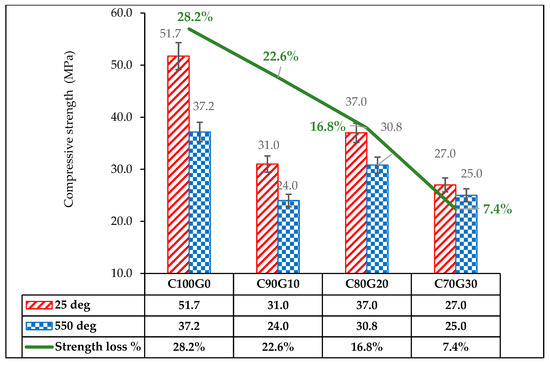- Generally, OPC (C100G0) and glass blended concrete (C80G20) subjected to thermal exposure of 550 °C had strength reductions of 28.2% and 16.8%, while the loss of density was 16.9% and 4.2%, respectively.