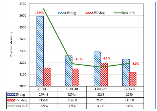 The glass blended concrete (C80G20) exposed to elevated temperature lost 22.6%, 16.8% and 7.4% of strength in C90G10. C80G20 and C70G30, respectively, whereas OPC concrete (C100G0) lost about 28.2% of strength, as shown in Figure 16. The strength retention is due to microstructural stability and thermal absorption by glass. The residual density (Figure 17) of the sample was 4.2% of pre-thermal treatment in C80G20. This further increased to 4.9% and 5.0% in C90G10 and C70G30, respectively, while OPC concrete lost 16.9 wt.% in density. This result implies that the use of glass particles in concrete in fire-resistant structures such as kitchens and incinerators can be effective because of the propensity to improve the durability of concrete structures.