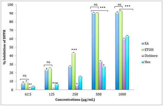 Scavenging effects of Cistus ladanifer Ethyl Acetate (E.A), Ethanolic (ETOH), Dichloromethane (Dichloro), and Hexanic (Hex) extracts on DPPH radicals (mean ± SD, n = 3 experiments, ns: not significant, p values; **: p < 0.01, *** p < 0.001).