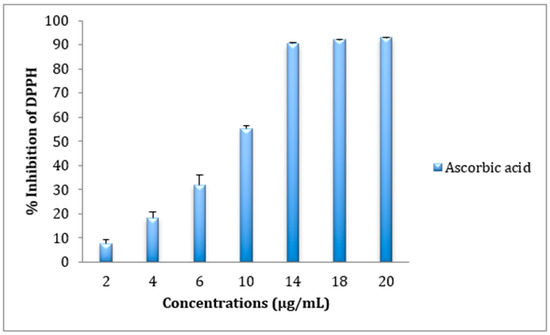 The free radical scavenging effect of ethyl Acetate, ethanolic, dichloromethane, and hexanic extracts of Cistus ladanifer was evaluated by use of DPPH test. As shown in Figure 1, the antioxidant activity of the four extracts increased as a function of increasing extract concentration. The IC50 values in Table 2 clearly showed that ethanolic extract was markedly a more potent scavenger of DPPH than the other extracts scoring an IC50 of 266.6 ± 0.828 μg/mL. However, the dichloromethane extract was considered a less effective radical scavenger recording an IC50 of 825.16 ± 11.18 μg/mL. The DPPH scavenging activity of ascorbic acid is shown in Figure 2.