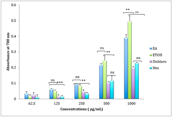 The FRAP assay was determined by the ferric reducing ability (Figure 3). As shown in Figure 3, the reducing power of extracts was dose-dependent manner. The results in Table 2, showed that the ethanolic extract demonstrated a higher reducing power that differs significantly from other extracts (p < 0.01) with the absorbance of 0.494 ± 0.035 at the highest concentration 1000 µg/mL.