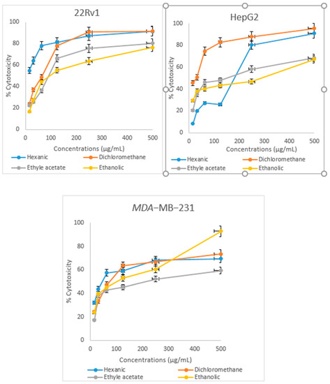 Antiproliferative effect of Cistus ladanifer extracts was evaluated on 22Rv1, HepG2, and MDA-MB-231 cell lines. The viability and cytotoxicity index percentages were plotted against various extract concentrations using the MTT technique, which demonstrated time- and dose-dependent effects (Figure 4 and Figure 5). On the three tested cell lines, hexanic, dichloromethane, ethyl acetate, and ethanolic extracts exerted an antiproliferative effect after 72 h of treatment. IC50 values for the four extracts are shown in Table 3. In HepG2 cells, the antiproliferative effect of the four extracts exhibited moderate cytotoxicity, and the dichloromethane extract seems to be more active on this line scoring an IC50 of 31.54 ± 0.242 μg/mL. Ethyl acetate, hexanic, and ethanolic extracts reduced viability of this line with IC50 values of 97.74 ± 0.148; 109.6 ± 0.166 and 180.5 ± 0.64 μg/mL respectively. In both 22Rv1 and MDA-MB-231 cell lines, the hexanic extract exhibited higher antiproliferative activity compared to the other extracts scoring values of IC50 of 11.32 ± 2.126 μg/mL and 82.4 ± 1.124 μg/mL, respectively. In 22Rv1 cell line and in a dose-dependent manner, dichloromethane, ethyl acetate, and ethanolic extracts inhibit 22Rv1 cell growth with IC50 ranging from 45.96 ± 0.125 to 61.47 ± 0.551 μg/mL. In the human breast cell line MDA-MB-231, ethanolic, dichloromethane, and ethyl acetate presented an important antiproliferative activity in a dose-dependent manner growth with IC50 ranging from 144.255 ± 12.43 to 290.33 ± 68.63 μg/mL. Interestingly, 22Rv1 line was considerably affected by the four extracts, compared to the two cell lines HepG2 line and MDA-MB-231. However, there is no significant difference observed between the extracts. (p > 0.05).
