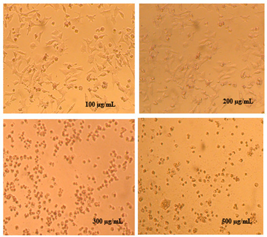 Cytopathic effects in MDA-MB-231 cancer cells after 72 h post-treatment with increasing concentration of Cistus ladanifer hexanic extract.