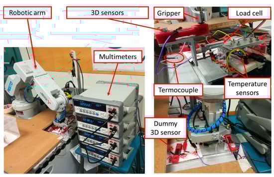 - Two FFF sensors, fabricated by using the same production parameters: one sensor under test (), which is pushed by the robot, and another dummy sensor (), subject only to temperature variations and environmental factors. In this way, it is possible to evaluate the effect of temperature changes separately.