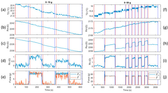 Preliminary on-off tests PF1 and PF2. From top to bottom: the digital temperature sensor (), the resistance of the dummy sensor (), the resistance of the sensor under test before () and after () compensation, and measured () and fitted () force. Each label’s beginning and end are a red and a blue vertical line, respectively. The 0–10 g test PF1 (a–e) has 5 labels, whereas the 0–50 g test PF2 (f–j) has 11 labels.