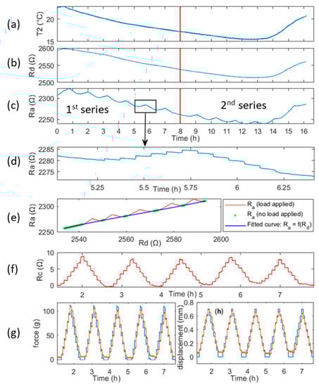 Figure 5f shows the resistance after temperature compensation is applied to the first series of cycles, the effect of temperature is mitigated, and the force/displacement is reconstructed (Figure 5g) by fitting a 1st-degree polynomial since 3rd- and 2nd-degree polynomials led to comparable results. No significant differences are found when calibrating with respect to force than displacement, as can be observed in Figure 5g. When considering only one series, the performance metrics improve, particularly for the first series, where RMSE and r are lower than 6.9% and 4.6% of the considered range, respectively, when applying temperature compensation (Table 2 and Table 3). This could be explained by observing Figure 5a, where the temperature change for the first series is monotonous, whereas it rapidly increases for the last two cycles of the second series. This indicates that when temperature variation is slow and monotonous, its compensation is easier to be performed, and small force steps can be easily detected and measured with better accuracy. This behavior suggests that the performance of temperature compensation should be verified in conditions similar to the target application.