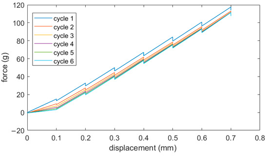 Again, as observed in test D1, the force for a given displacement decreases as long as the test proceeds from cycle to cycle, which is clearly shown in Figure 6. It can be seen that the largest difference, of about 6 g, is between the first and the second cycle and becomes smaller subsequently. Hence, the first cycle has been discarded from calibration data. Moreover, during each step in which the displacement is held constant, it is observed that force can decrease up to 3 g. Within each cycle, multiple force values are measured at the same displacement step due to the force settling time caused by the viscoelasticity of the TPU structure.