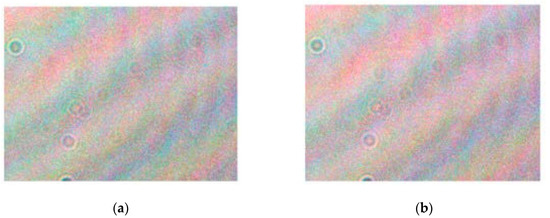 The color holograms of the nonacid etching sample in group A are shown in Figure 3, with load = 45 N for Figure 3a and load = 46 N for Figure 3b. These figures were directly collected by CCD and were not processed by the numerical calculation program. Many interference fringes can be observed in Figure 3, and are produced by the interference of the object light and the reference light. A few spots in the hologram are speckle noise and were caused by a small amount of dust in the optical system. These could be eliminated by subsequent numerical calculation. Although the load only changed by 1 N, the interference fringe spacing and the intensity of the image changed significantly. This shows that the detection system can measure the subtle changes in the sample under a small external force. The color holograms contain the information of the whole sample surface, whereas the atomic force microscope detection system can only detect a small part of the sample surface [13].