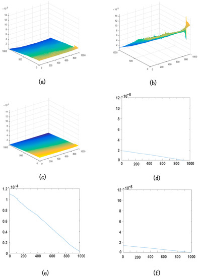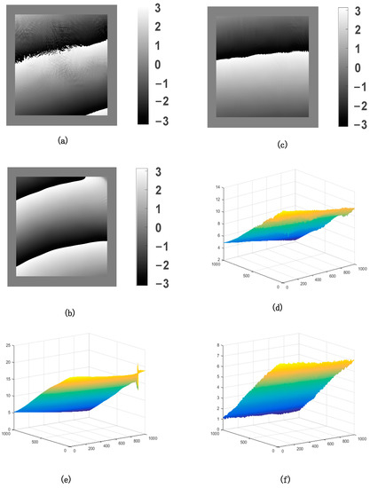 The wrapping phase differences and real phase differences for the three-color laser are shown in Figure 4. Figure 4a–c represents the wrapping phase differences for the red laser, the green laser, and the blue laser, respectively. Figure 4d–f represents the real phase differences for the red laser, the green laser, and the blue laser, respectively. These figures were obtained from holograms by the numerical calculation program, and the numerical calculation time was less than 1 s from the holograms to the reconstruction of the three-dimensional deformation field. It can be seen that the phase difference of the three images (Figure 4a–c) is small; this is because the anti-tangent function was used to calculate the phase difference, resulting in the phase difference of the unwrapped phase (Figure 4a–c) being in the range of . By comparison, the actual phase differences after unwrapping (Figure 4d–f) vary greatly, which is due to the large difference in the wavelength and the incident angle of the three-color laser.