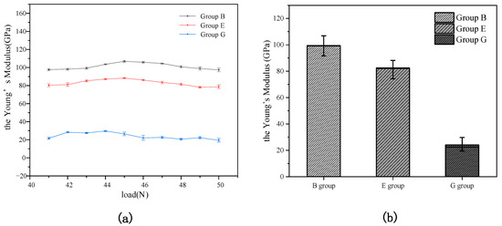 Young’s modulus Change curve of Group B, Group E, and Group G for (a) and Young’s modulus average value of Group B, Group E, and Group G for (b).