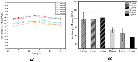 Young’s modulus Change curve of Groups A–F for (a) and Young’s modulus average value of Groups A–F for (b).