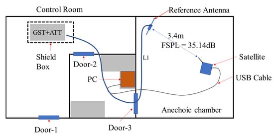 The GST was placed inside the shield box outside the control room to reduce the effect of possible leakage from the GST LoRa transceiver to the payload receiver. A reference antenna with a known gain (G1) was placed 3.40 m away from the satellite, which was connected to the GST using a cable with a cable loss of L1. The GST transmitted data packets to the satellite continuously, and the data reception was recorded on the satellite memory while monitoring through the serial monitor connected to the receiver payload. In addition, it was routed to the control room using a USB cable and attenuators (ATT) were added to the GST side until the receiver payload could no longer receive the data packets. The success rate was calculated by checking whether correct data packets without byte errors were received at the receiver side. The sensitivity was taken for the attenuation for which at least 60% of the overall packets were received correctly.