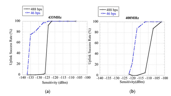 Various combinations of SF and BW were tested for achieving different data rates and receiver sensitivities by the same setup. As a result, the optimal settings obtained balancing the date rate and the sensitivity are determined to be with SF 12, BW 31.25 kHz, and CR 4/8. The resulting data rate is 46 bps. Additionally, a receiver with SF 8, BW 31.25 kHz and CR 4/8 resulting in a data rate of 488 bps was also tested to understand the relationship between data rate and sensitivity. The results of the tests are shown in