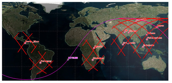 The orbital path of the KITSUNE is simulated for 24 h in STK software, and all possible passes for GST network countries participating in the SIoT mission are generated. On average, each country has five passes per day while each pass varies between four minutes to ten minutes. The path of the passes is shown in