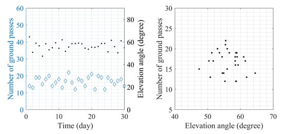 For in-depth analysis of number of visible GSTs for a longer period, the orbital path was simulated for one month (31 days) for elevation angles greater than 33 degrees. The result of the simulation is summarized in