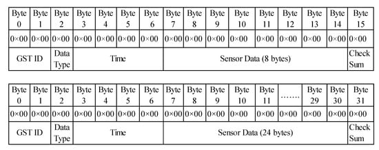 Since many GSTs are expected to be deployed in various parts of the world, it is imperative to identify the data source as the origin country and the location of the GST. As a result, a data packet format has been standardized for all GSTs, which includes GST ID, data type, time of data collection and sensor data. Two bytes are assigned for GST ID, and the first byte is for country identification. The second byte is used when there is more than one GST in a country, and it would be identified by using the second byte. The data type specifies what kind of data and how many kinds of data are uplinkeded in the packet. Four bytes are assigned for timestamp, which is the time at which the sensor data was recorded, and it should include seconds, minutes, hour, day, month, and year. Each country can choose whether they want to send data with either short or long data packet format. The optimal data packet length is set to 32 bytes since longer data transmission time consumes more power, and the data packets can have errors due to doppler shift rate and unstable attitude of the satellite. A checksum byte is assigned at the end of the packet to ensure the satellite received the correct packet. The packet formats for GSTs are shown in