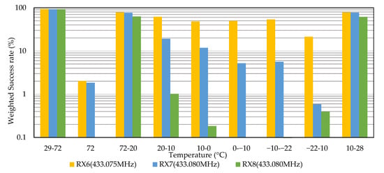 It was observed that the receiver performance was not affected by increase in temperature up to 72 °C; however, only 3 packets out of 105 packets were received by RX6 and RX7 with a byte success rate of 64% at 72 °C. The performance of the receivers deteriorated when the temperature was reduced below 20 °C, an apparent change in the center frequency was noted since the receiver RX6 received more packets with correct bytes than RX7 and RX8. At cold temperatures, the center frequency of the receiver increased. The performance of the RX-7 further reduced at lower temperatures while RX6 continued to receive packets with 50%-byte success rate. At the minimum of −22 °C, the success rate was low for all the receivers, nevertheless RX6 continued to perform better than the other two. The temperature was increased to set the receivers to ambient temperature and just over 10 °C, and all receivers received the correct data packets.