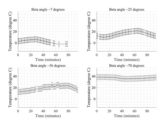 Figure 19. The beta angle is above 25 degrees for 59% of the total simulated duration. Using Equation (7) for the total amount of data that can be collected inclusive of temperature impact, about 70% from the total estimated data for one year could be retrieved.