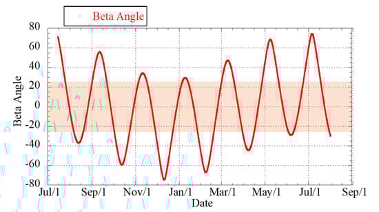 The absolute beta angles in the LEO orbit of 400 km vary between 0–74 degrees, and the beta angle simulation is performed in STK software for the period of one year, as shown in
