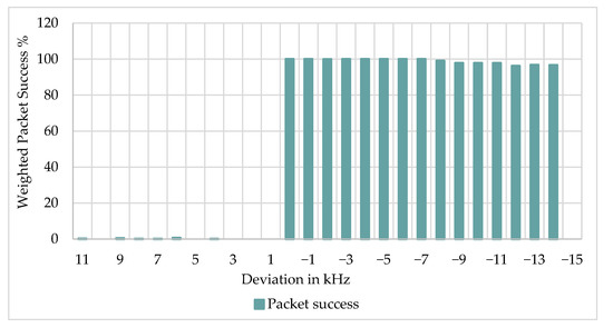 In LEO satellite at 400 km, the Doppler effect can cause a frequency offset of up to ±10 kHz to the data signal arriving at the receiver. Many studies on the ground for LoRa modulation immunity to the Doppler effect were performed. To confirm the immunity of the designed receivers against the static Doppler effect, the designed receivers were configured to have center frequency deviation in steps of 1 kHz up to ±15 kHz and 100 data packets were transmitted at each deviation. The success rate was calculated based on the number of packets received and the correctness of the bytes. The tests confirmed that the receivers could receive data packets with 95% accuracy up to −14 kHz deviation, but positive deviations were not tolerated. The summary of the results is depicted in