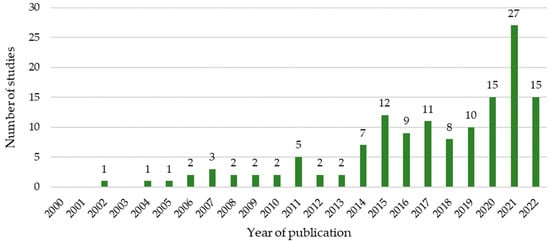Of the 133 studies included (Appendix A), most were from 2021 (27 studies), but the years 2020 and 2022 also are highly represented, with 15 studies each. There are few studies from the early years of the 21st century, with only three articles from 2000 to 2005 and 11 articles from 2006 to 2010 (Figure 1). The diversity of the sources was very high, with articles from 35 different journals, of which the most frequent are LWT—Food Science and Technology (32 articles), Journal of Texture Studies (27 articles), Journal of Cereal Science (9 articles), Food Chemistry (8 articles), Innovative Food Science & Emerging Technologies (6 articles), International Journal of Gastronomy and Food Science (6 articles) and Food Hydrocolloids (5 articles).