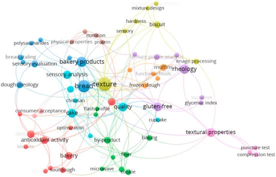 The 133 bibliographic sources included in the review were analyzed using the software VOSviewer. The diagram in Figure 2 evidences the co-occurrence links between keywords in the articles that occurred at least two times. From the 432 keywords, the analysis extracted 66 keywords satisfying the criteria, from which two did not have any relation with others and therefore were excluded, resulting in a map with 64 keywords. The sizes of the circles and the corresponding labels correspond to each keyword’s relative frequency of occurrence. The number of articles in which the keywords occur jointly corresponds to their relatedness, which is represented by the proximity of the circles. Figure 2 shows which keywords were more frequent: texture, bread, bakery products and rheology. The 64 keywords produced 10 clusters, with 174 links and a total link strength of 190. The most separated cluster included four keywords, the most relevant being textural properties, puncture test and compression test.