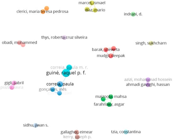 Similarly, Figure 3 presents the co-authorship links between authors in the bibliographic sources that occurred at least twice. There were 607 authors, from which 29 met the criteria of appearing at least twice. Some of the 29 authors in the network were not connected to authors in other articles, thus producing 15 clusters with 19 links and a total link strength of 36. The largest number of connected authors consisted of five, corresponding to a cluster cantered in authors Guiné R. linked with Correia P.
