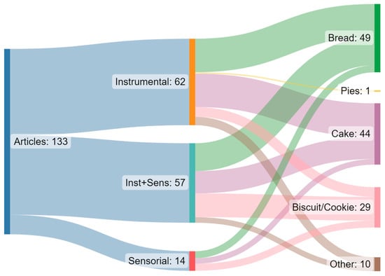 Of the 133 articles in the review, part of these reported only instrumental measurement of textural properties (62 studies), while others focused only on sensory evaluation of textural attributes (14 studies). However, there were many studies in which both evaluation methods were used (57 studies) (Figure 5). The flow diagram in Figure 5 further shows that a high number is about bread or cake from the articles that report instrumental tests. In contrast, in the articles that report both types of evaluation for the textural properties, a high number refer to biscuit/cookie.