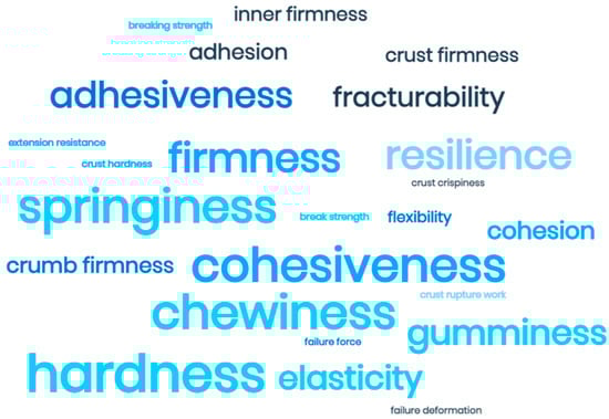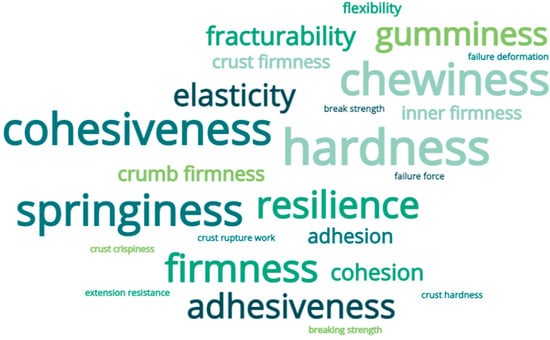 The properties measured through instrumental texture analysis in bakery products include hardness, cohesiveness, chewiness, springiness, firmness and resilience, as visible from the word cloud depicted in Figure 6. Although similar, some textural properties appear with different descriptions in the articles, for example, the measurement of hardness and firmness, which are fundamentally the same. Moreover, cohesiveness and cohesion are different notations for the same textural property; the same happens for adhesiveness and adhesion.