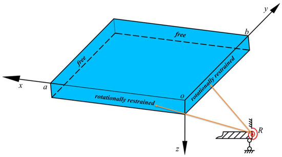 Through the above solving procedure, it is clear that the preselected trial function satisfies the boundaries in Equation (4) automatically. The assumed deflection is still required to satisfy the boundaries in Equation (5), which can determine the unknown constants in . The boundary condition at the rotationally restrained edge will be satisfied by substituting the Equation (16) and the slopes in Equations (8) and (9) into Equation (5), which produces Equations (20) and (22). Similarly, utilizing the second-order derivatives of in Equations (8) and (9) to acquire the bending moments at free edges and letting them to be equal to zero, which can satisfy the remain bending moments requirements and produce Equations (21) and (23).