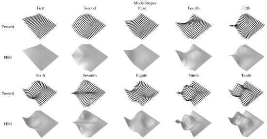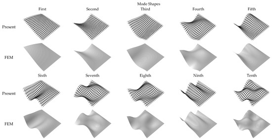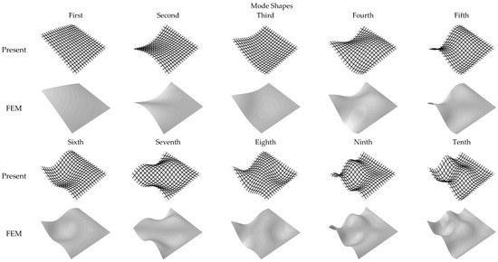 The complicated title problem can be turned into dealing with sets of infinite linear algebra equations composed of Equations (24)–(27) via the above derivations. A zero determinant of above matrix is needed since the requirement of non-zero solutions, which gives the natural frequencies. Subsequently, the constants , , and () can be acquired by substituting the obtained natural frequencies into the corresponding matrix. Finally, the associate free vibration mode shapes will be determined through using the determined by the acquired constants. It is theoretically possible for one to obtain exact results when m and n are close to infinity. Actually, convergent results with desired accuracy can be obtained by solving sets of finite equations containing the identical count of unknowns. In the present study, the identical terms s is selected for m and n, with their upper limit setting at and .