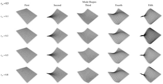 First five mode shapes of the RRFF square plates with , and equaling 0.1, 0.3, 0.5 and 0.0.8., respectively.