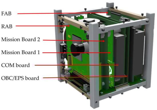 The satellites of the BIRDS-3 and BIRDS-4 constellations are based on the 1U CubeSat standard. The external dimensions are (114.5 × 107.8 × 104) mm, and they have an average mass of 1.3 kg. The bus system consists of the front access board (FAB), the electrical power system (EPS), the onboard computer (OBC), the communication board (COM), and the rear access board (RAB). All printed circuit boards (PCBs) are connected to a backplane board via 50-pin connectors. Figure 1 shows the bus system configuration.
