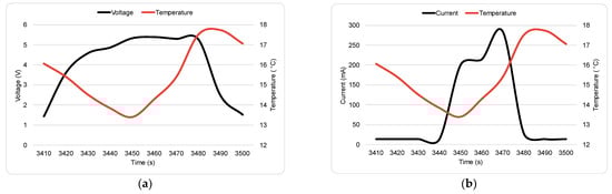We can find a correlation among the solar panel’s parameters by analyzing the telemetry data. Figure 5a shows the correlation between the voltage and the temperature of the +Y panel when it faces the sun for approximately 90 s at varying angles while rotating. Figure 5b shows the correlation between the current and the temperature of the same panel for the same time window. A slight delay can be observed in the current graph compared to the voltage graph. Significant current only flows for approximately 40 s because of a specific potential difference required in the circuit between the panel output and the input of the DC/DC converter for the current to start flowing.