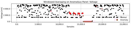 The results of feature extraction by windowed averaging cause rapid fluctuations in data changes to be isolated for a specific interval. Figure 9 illustrates how the windowed averaging process results in a voltage dataset from an anomaly-contaminated panel by applying (3)–(5). We decided on the value of 50 as an optimal value of the window interval for the windowed averaging technique.