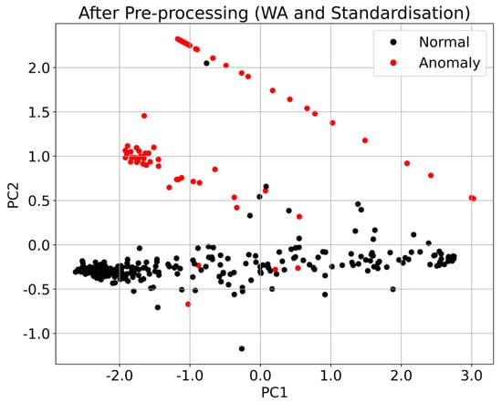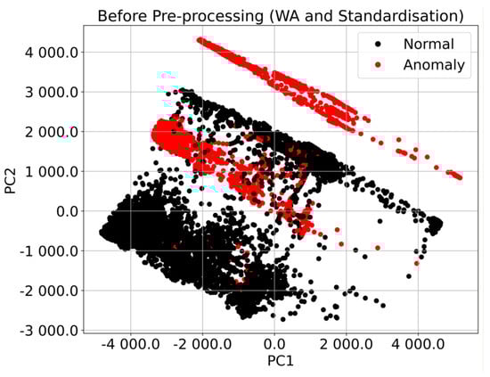 Pre-processing techniques attempt to extract and enhance specific features (e.g., patterns, structure, trends) within the dataset sample. In the non-sequential analysis, the model expects this stage to increase the variance between classes in the dataset. Hence, the output forms distinctive features among classes. Implicitly, it allows the ML models to distinguish the samples. The process begins with data pre-processing using windowed averaging, standardization, and Principal Component Analysis. All three techniques were applied to the input samples that were the output of the dataset preparation phase. The analysis used two telemetry data, namely, current and voltage. Figure 8 shows the initial data distribution patterns for the voltage parameter before applying the pre-processing techniques. The figure indicates the different sample distributions of the anomalous and normal data classes. Through visual observation, we can clearly distinguish the two categories. However, it is difficult to identify the anomaly class if the analysis is based on simple thresholding. It can be seen that the anomalous patterns are located in the center of the vertical axis. However, the problem with simple thresholding is that the process may incorrectly categorize a sample in the transition state as an anomaly, especially a type 2 anomaly. Thus, a data pre-processing step is crucial to extract the anomalous patterns so that the ML model has distinguishable input samples.