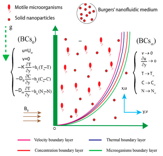 Taking into account the hypotheses proposed, the regulating formulas and appropriate boundary constraints for the Burgers’ nanofluid flowing are as follows [69,70]: