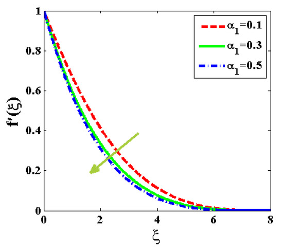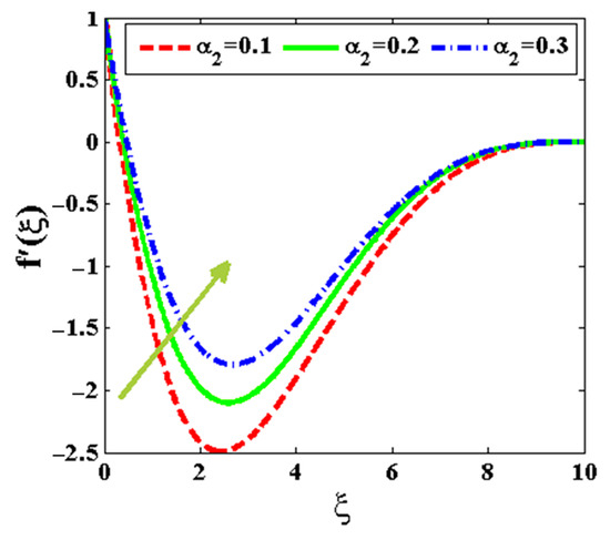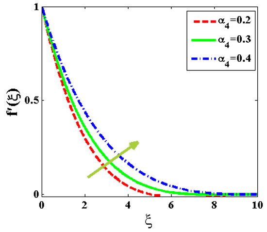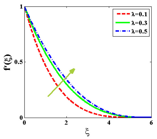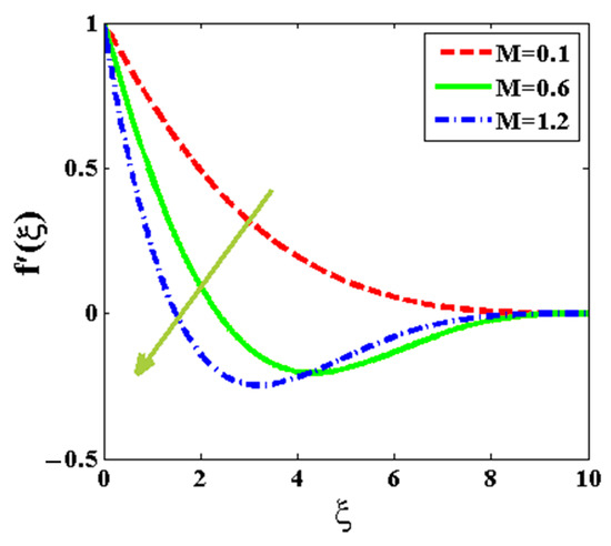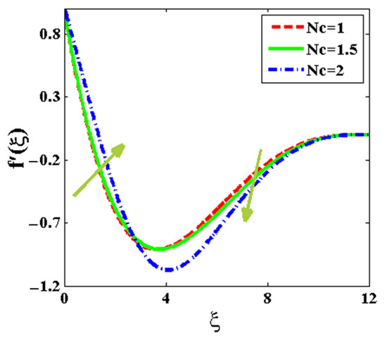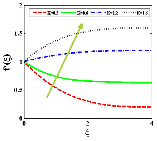 In Figure 8, the increasing number of the magnetized force opposed the flowing velocity outline as presented. The motile microorganisms were damped due to an induced electromagnetic force that resists the nanoparticles’ free collision. This accordingly affects heat transfer, thereby meaningfully impacting the flow rate. The impact of the bioconvective Rayleigh quantity on the nanofluid flow rapidity is investigated in Figure 9. The Rayleigh number is connected with the convective buoyancy-driven flow; an increase in the Rayleigh number caused a rising flow velocity field near the stretching wall due to an enhanced heat gradient. The effect reduces along the far stream because of an increased fluid shear stress, which restricts the free flow of motile microbes. Hence, the velocity profile reduced and increased with the Rayleigh number variation. The sensitivity of the flow velocity to rising buoyancy ratio number is displayed in Figure 10. The velocity distribution was reduced as a result of the dominance of the fluid viscosity over the thermal buoyancy. As observed, the motile microorganisms of the nanofluid interaction were hampered, resulting in a significant decrease in the flow rate field. In Figure 11, the effect of increasing combined convective term on the rapidity distribution is examined. The combined natural and force convection denoting mixed convection raised the up-swimming of the microorganisms in a suspended nanoparticle, which led to an enhanced flow rate profile. The flow dimension is a result of the acted coupled convection mechanism on the Burger’s nanofluid, which propels high heat transfer past the stretched sheet. As such, the buoyancy and pressure forces interacted to boost heat propagation, which inspired the magnetized fluid velocity field. As well, in Figure 12, the parameter K significantly increased the velocity field of the motile microbes in the Burger’s nanofluid. The thermal conductivity of the fluid is stretched to create a free particle collision, thereby magnifying the velocity distribution.