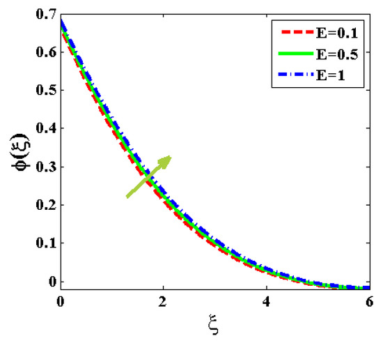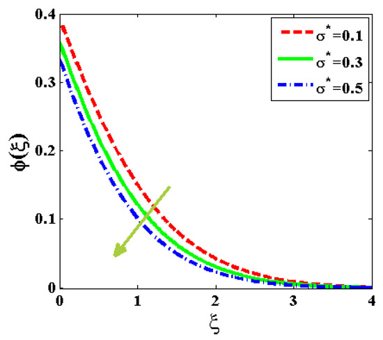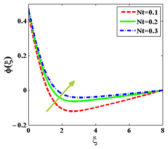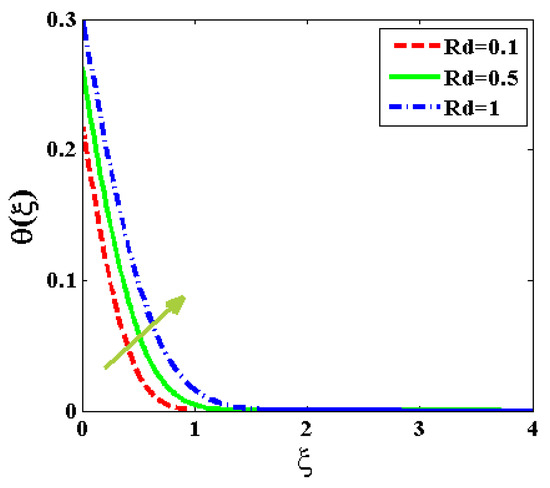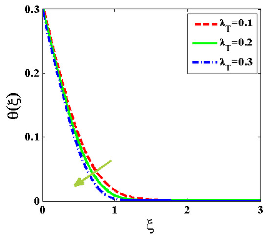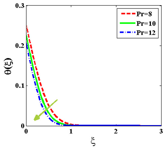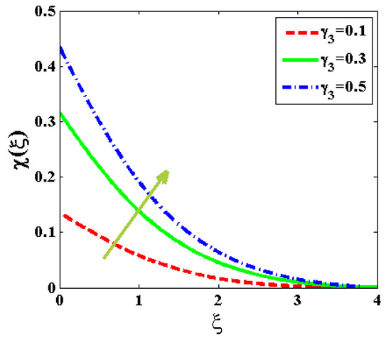 Figure 13, Figure 14 and Figure 15 display the influence of the radiation term , bio-convective term and heat Biot number on the temperature distribution. The terms are a strong source of heat generation that stimulate internal heating. As observed, the heat propagation in the stretching device was boosted by the existence of Fourier and Fick thermal conductivity and low thermal diffusion. Hence, the temperature profile was increased as the nanoparticle random movement was enhanced. Therefore, in a chemical and thermal system, the terms that enhance heat transfer should be monitored to guide against chemical reaction blowup. In Figure 16 and Figure 17, The response of the heat transfer to enhancing Prandtl number and heat relaxation term is demonstrated. As noticed, the temperature field was reduced in magnitude along with the swimming motile microorganisms due to the high diffusion of heat to the environment, which was a result of a thinner energy boundary layer. The rising ambient heat dispersion reduces nanoparticles’ thermal conductivity. Hence, momentum viscosity dominates the thermal conductivity, thereby restricting Burger’s fluid molecular interaction. As such, the temperature distribution is decreased.