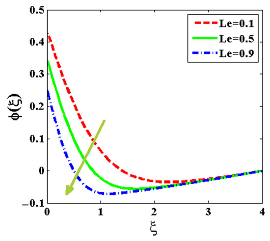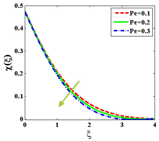 The effect of the thermofluid terms on the mass transfer are displayed in Figure 18, Figure 19, Figure 20, Figure 21, Figure 22, Figure 23 and Figure 24. The sensitivity of the reacting species to varying parameters is shown in the respective plots. In Figure 18, Figure 19 and Figure 20, the impression of active energy , thermophoresis term and the species Biot quantity is checked on the concentration distribution. The terms propel the solution concentration field due to the stimulation of internal energy that induced the species reaction along the boundless stream. Motile microorganism reaction close to the stretchable sheet is more noticeable than at far stream because of the rising wall thermal conductivity. Moreover, Burger’s nanofluid thermal reaction is boosted to inspire heat transfer, thereby leading to an enhanced chemical concentration distribution. In Figure 21, Figure 22, Figure 23 and Figure 24, the mass transfer diminished with a variational rise in the Brownian diffusion , Lewis number , chemical reaction term , and relaxation time . The low heat transfer through nanoparticles and motile microorganisms is due to the high molecular bond and shear stress that resists the concentration profiles. This is as well supported by the species boundary layer viscosity that supports chemical solution diffusion, thereby damping the species mass distribution. The plot of against depicting the motile microorganism distribution for parameter variations is given in Figure 25, Figure 26, Figure 27 and Figure 28. In Figure 25 and Figure 26, the impact of the bioconvective term and microorganism Biot number are examined. As is shown, the swimming microorganism distribution is increased with an enhanced parameter value because of created internal heating. The flow dimensions are due to the high-density gradient caused by the collection of convective macroscopic motion. The Biot number creates microorganism thermal resistances at the surface and inside the body to stimulate heat transfer. Therefore, the motile microbes profiled are propelled. Meanwhile, the opposite effect was obtained for the rising Peclet number and microorganism different number as seen in Figure 27 and Figure 28. The flow behavior is due to the shallow random suspensions and volume cell fraction of the motile microorganism dispersion pattern. As such, the microorganism distribution is damped in magnitude significantly.