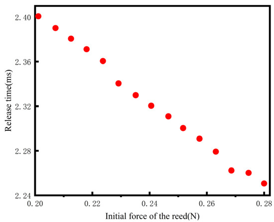 The simulation results show an approximately linear relationship between the external performance parameter (release time ) and the underlying performance parameter (reed initial force ) within a certain range of reed reaction force reduction. Therefore, this paper uses Equation (4) to express the relationship between the two: