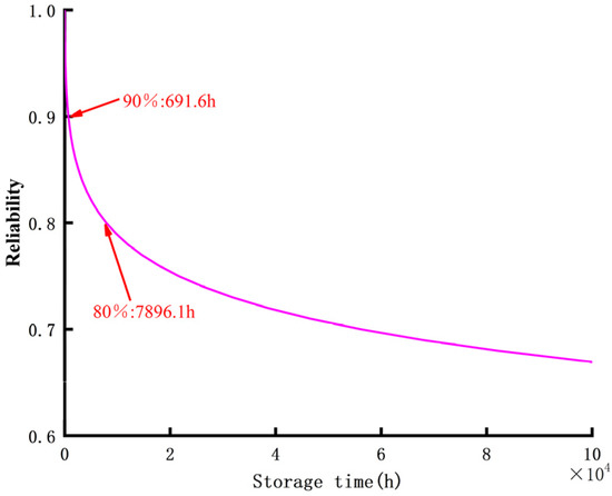 After all the uncertainty distribution parameters of the degradation model parameters are obtained, the storage reliability curve of the batch of AEMRs can be solved according to the reliability function, and the curve in Figure 7 shows the reliability life . From the trend of the curve, it can be seen that the product’s reliability decreases at the fastest rate in the early stage and gradually levels off in the middle and late stages, which also coincides with the law of stress relaxation.
