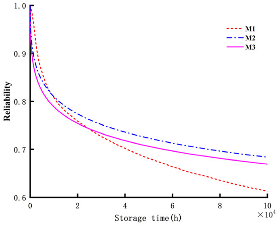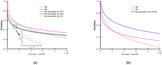 For the product failure threshold , when evaluating the same batch of products of a given model, the engineer usually gives a fixed value for calculation. However, in the actual product production process, due to the different distribution of the initial state of the product, heterogeneity will arise between batches of products, and thus, the failure threshold will vary from product to product. Therefore, considering the uncertainty of the failure threshold in the evaluation process is expected to improve the calculation accuracy. Since the uncertainty of the failure threshold has been considered in the modeling above, in this part, is taken as a fixed value, and then, the reliability is calculated. The results are shown in Figure 10b, from which it can be seen that the uncertainty of the parameter has not been considered, resulting in a large deviation of the reliability evaluation result, and its MAE is 0.091, a 207% increase compared to the MAE between M3 and M1. It can be seen that considering the influence of the uncertainty of the failure threshold, in the process of a storage reliability assessment of batch products, can reflect the influence of the heterogeneity of batch products, so more accurate assessment results can be obtained.