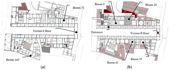On the first floor of the museum, three rooms were considered (Figure 3). The Verone I floor (Figure 3a) has views from every orientation with large windows and mainly hosts ancient statues and busts. Sampling was performed near the north-facing window. The Verone I floor has a floor area of 201.04 m2, a height of 8.17 m and a volume of 1642.50 m3. It is equipped with an HVAC system for control all year of temperature and relative humidity, managed by a remote monitoring and control system. The primary ventilation air comes from the AHU, using supply fans with variable flow (nominal air flow rate of 1400 m3/h), and enters the room through floor inductors. There is no recirculated air.