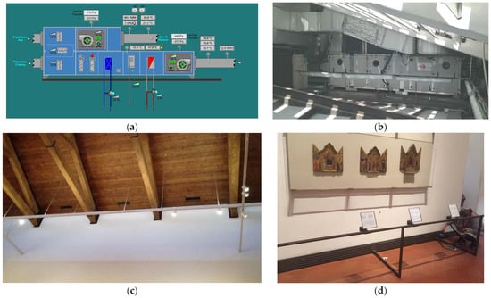 With respect to the HVAC system serving the building, the Uffizi Gallery is mainly equipped with HVAC systems which recirculate the air, for the control of air temperature and relative humidity, all year. Moreover, the system is managed by a remote monitoring and control system, positioned in a technical room, that also controls the fire system, the security system, and the electrical system. As an example, Figure 2 shows the air handling unit (AHU) control system of Room 2 and some pictures of the room.