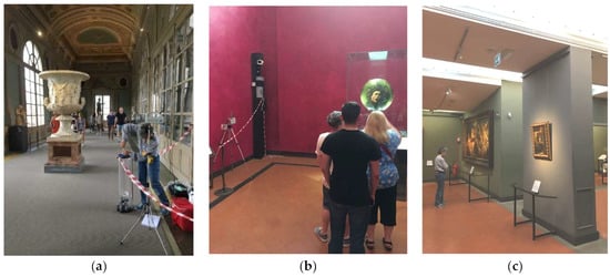 The defined methodology was implemented and validated in selected rooms of the Uffizi Gallery Museum in Florence, Italy. This is a large museum that is among the most famous in the world. The Uffizi Gallery hosts priceless artwork collections that include paintings by Italian artists from the 14th-century and the Renaissance (e.g., Leonardo, Raffaello, Giotto, Piero della Francesca, Simone Martini, Filippo Lippi, Beato Angelico, Mantegna, Botticelli, Correggio, Michelangelo, and Caravaggio). Numerous precious works by European painters from the same historic period (mainly Dutch, Flemish, and German), and a collection of ancient statues and busts [] from the Medici family, are also displayed in the museum. The latter are ancient Roman copies of lost Greek sculptures that adorn the corridors of the Uffizi Gallery. The museum is located on the first and second floors of a valuable historical building in the city center of Florence, designed by Giorgio Vasari and dating back to 1560–1580.