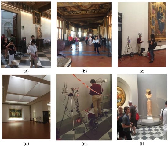 Analyzed rooms on the second floor of the Uffizi Gallery: (a) Entrance, (b) Verone II floor, (c) Room 2, (d) Room 10, (e) Room 35 and (f) Room 41.