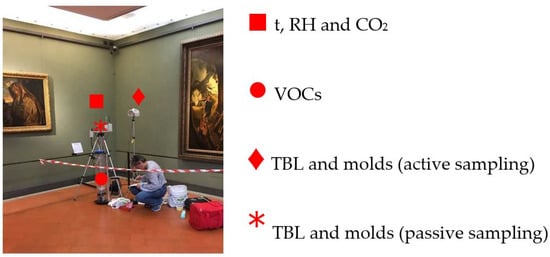 Both active and passive methods were used in the biological analysis to sample TBL and molds. Active sampling involved the collection of air flow with a surface air system impactor (sampling rate of 100 L/min). However, the sampling rate and, thus, the total air volume varied from 0.3 to 1 m3, according to the different occupational patterns of the monitored museum room, assuming a potentially higher pollutant concentration in relation to a greater presence of visitors. Passive sampling was used to gather information about the microbial load, using Petri dishes positioned next to the microclimatic station (Φ = 90 mm, plate count agar for microbial growth and Sabouraud dextrose agar for mold growth). The microbial load naturally falls on the plate as an effect of the movement of air (due to both the passage of people and to the air flows from the HVAC systems). Using this method, the total biological pollution was measured for 2 h. At the end of the sampling period, the dishes from the active and passive methods were analyzed in an external laboratory where they were incubated at the required temperature-time range (three days at 30 °C for TBL and five days at 25 °C for molds). Thereafter, the samples were analyzed to determine the CFU for both bacteria and molds according to the ISS Report [].