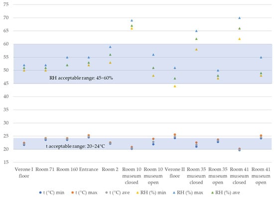 Figure 6 shows, for each analyzed room and monitoring period, the minimum, average, and maximum measured values for air temperature (t) and relative humidity (RH). The values were compared with narrow ranges considered acceptable for both artwork conservation (paintings—19 ÷ 24 °C for temperature and 45 ÷ 65% for relative humidity []) and for the comfort of people (20 ÷ 26 °C for temperature and 40 ÷ 60% for relative humidity [,]), i.e., 20 ÷ 24 °C for temperature and 45 ÷ 60% for relative humidity.